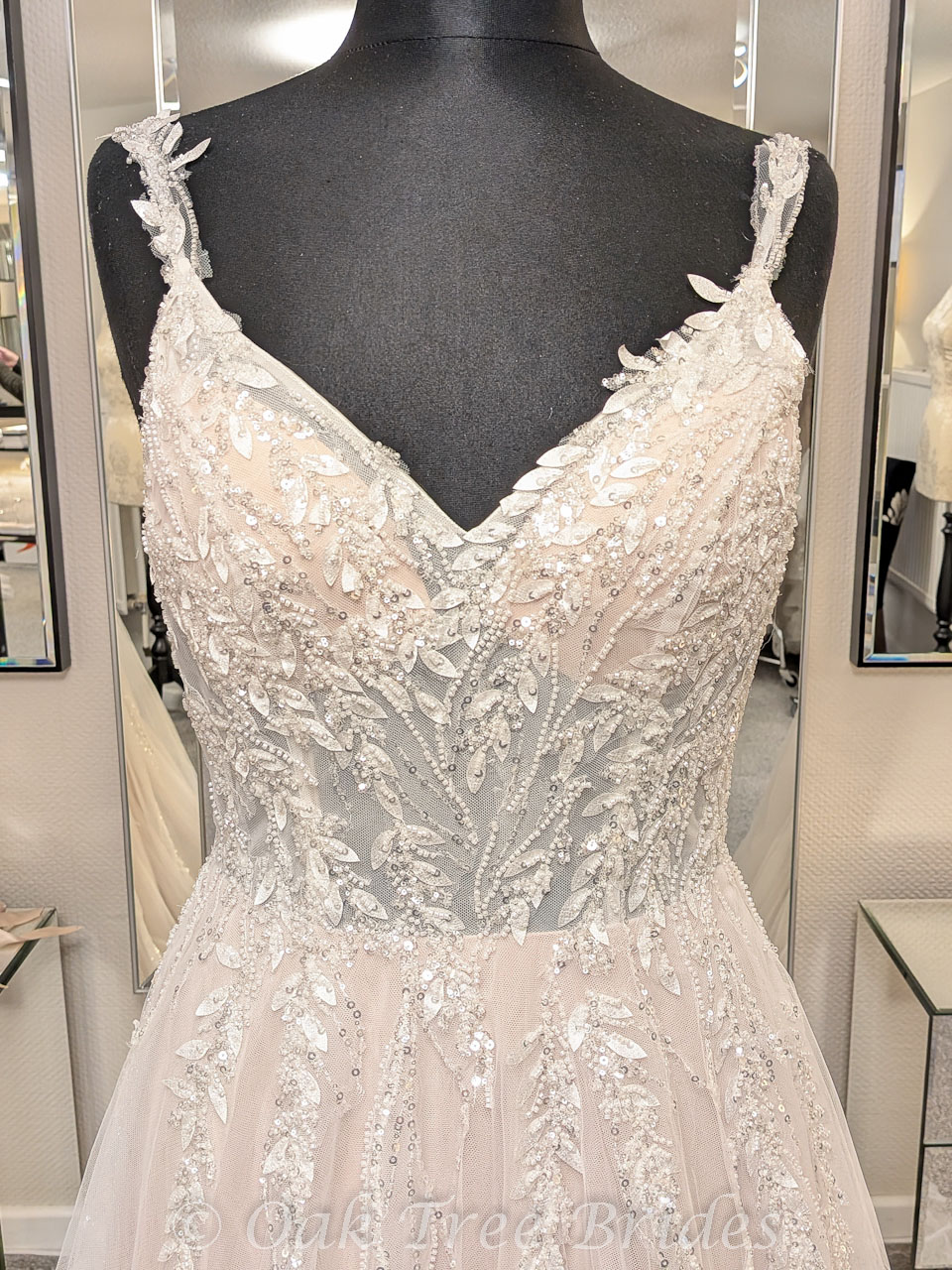Description : A sparkling A-line gown with vine-like embroidery and soft tulle skirt with glitter tulle underlay.
