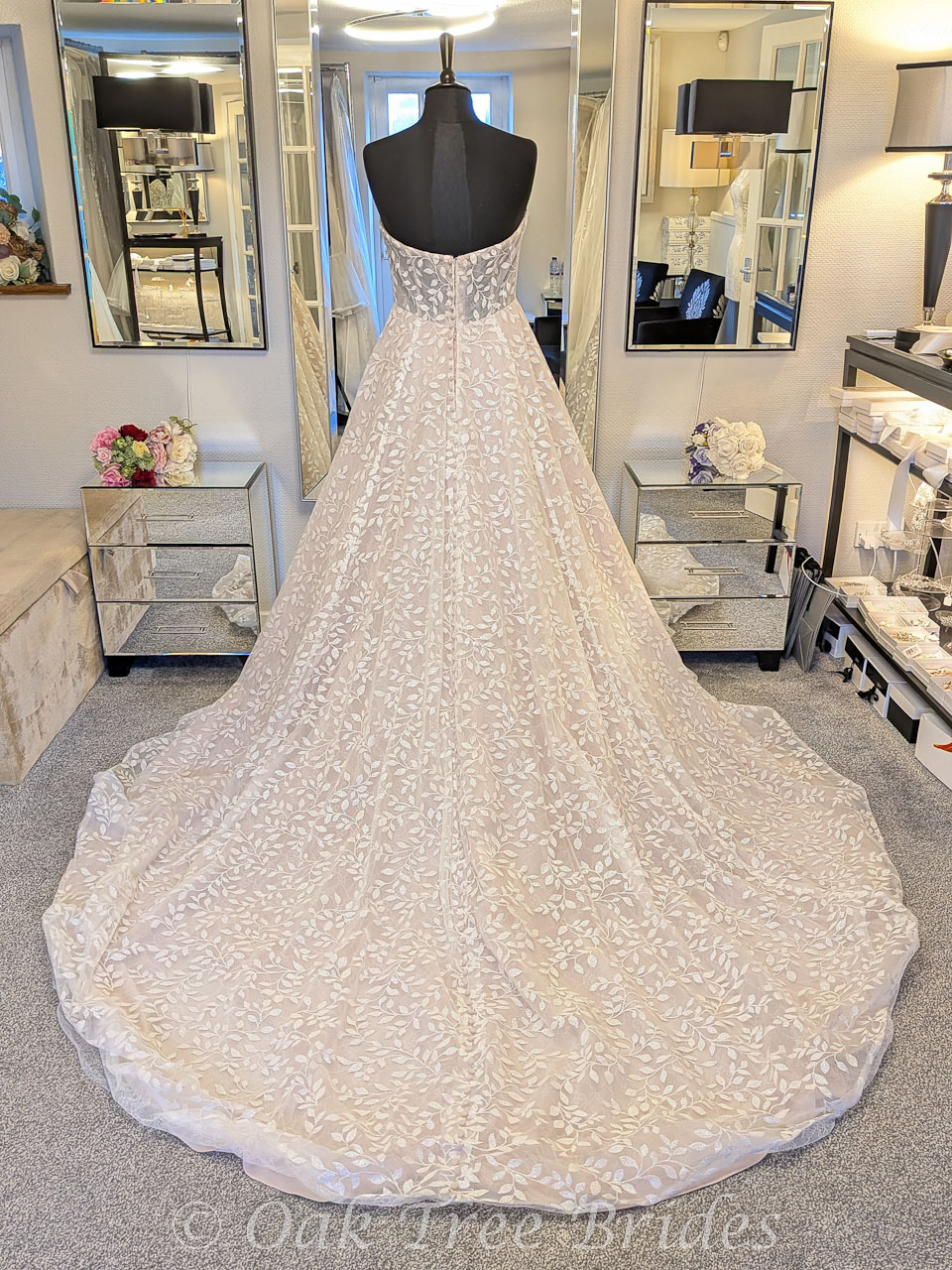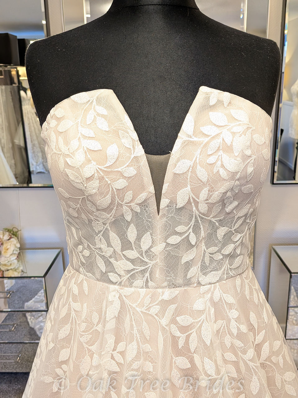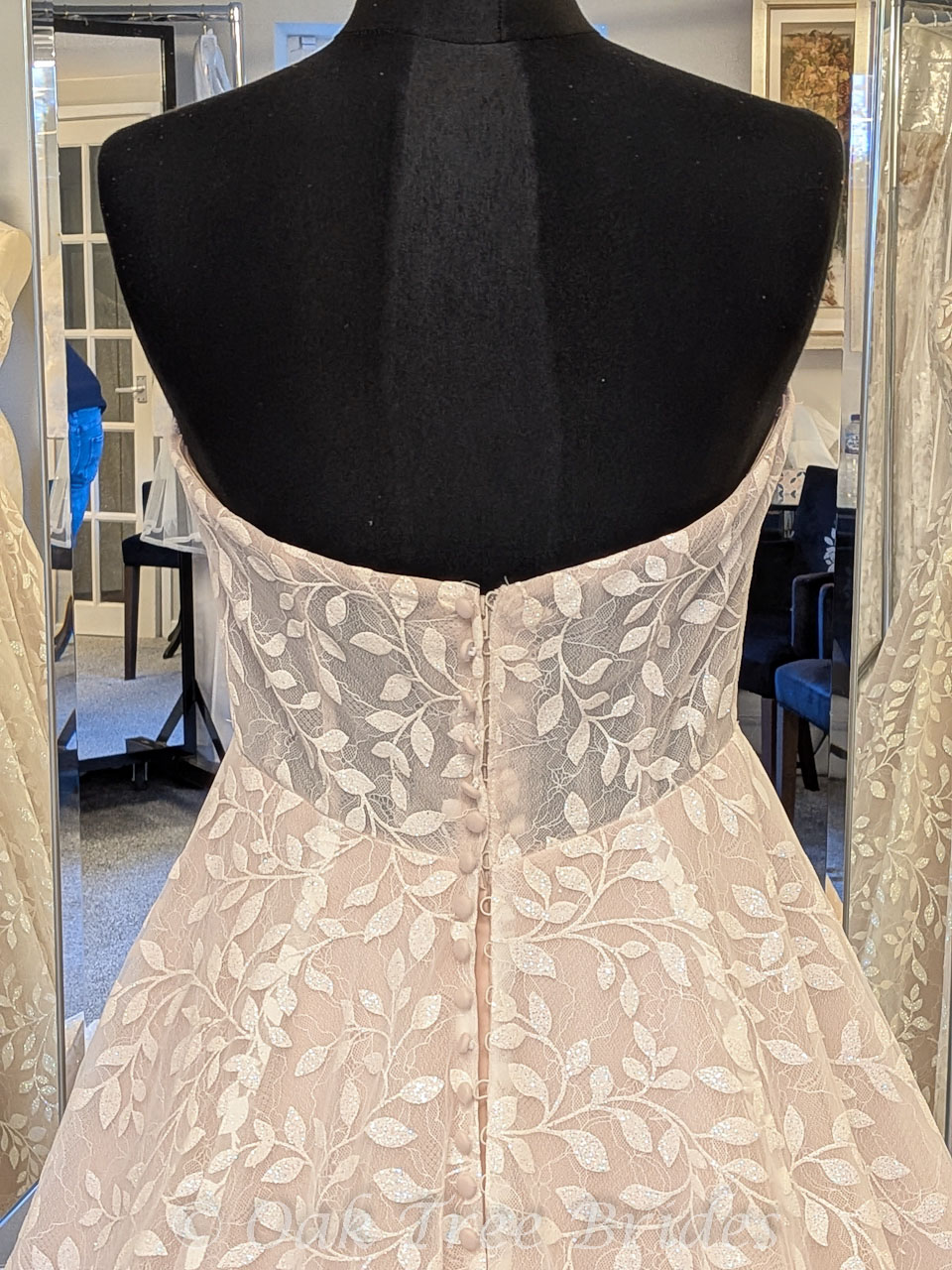Description : An A-line gown in an ivory sparkly, leafy lace over biscotti gown with a deep-notched, sweetheart neckline. Covered buttons adorn the back of the gown continuing down the train.