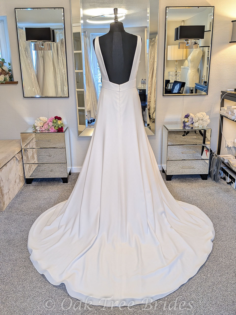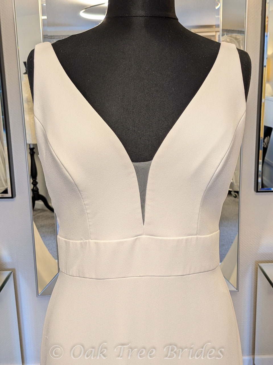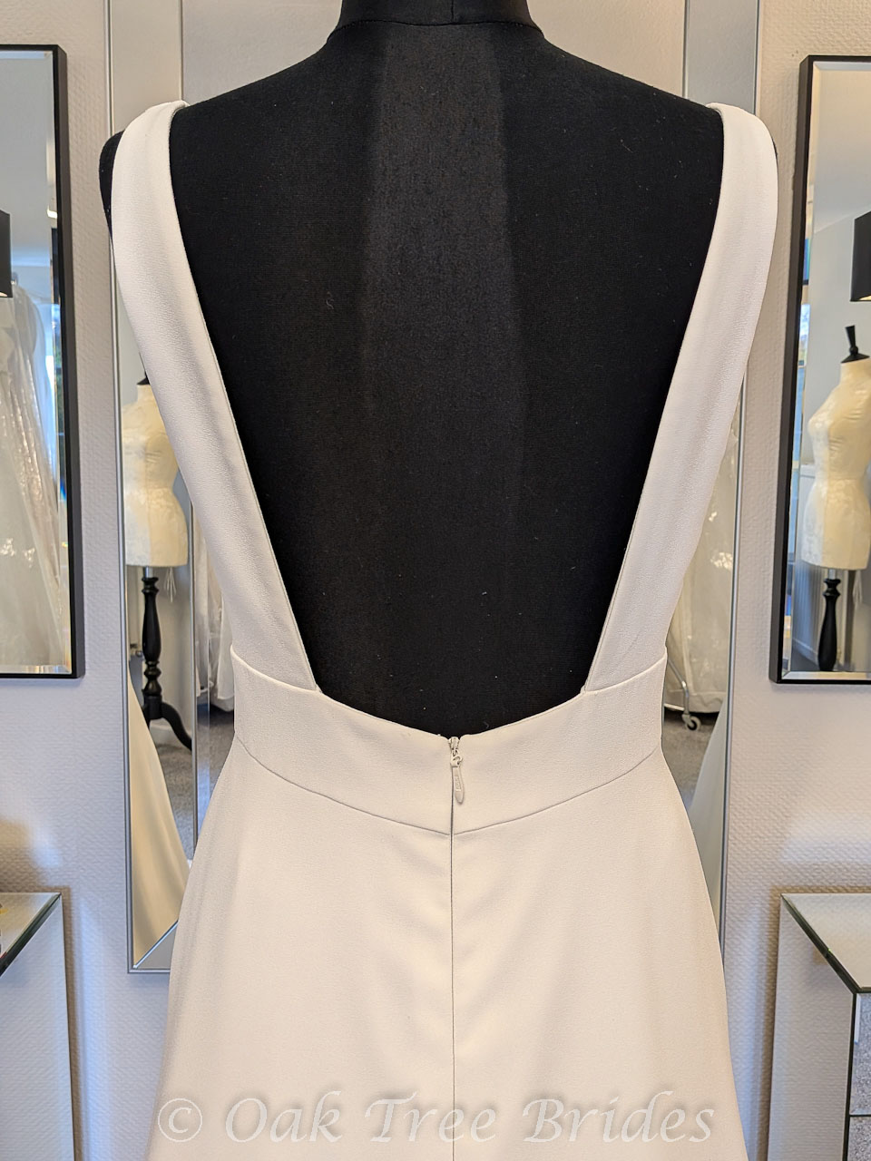 Description : A modified A-line gown in ivory crepe with plunging V-neckline and open back.