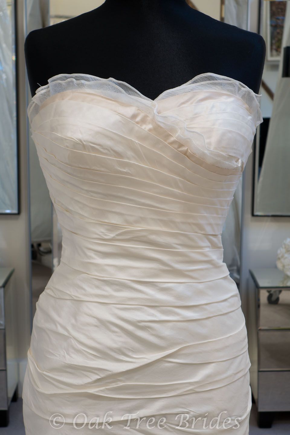 Description : A silk dupion, mermaid bridal gown with organza trimmed, sweetheart neckline. Ruched bodice and large silk/organza blush roses at the knee.