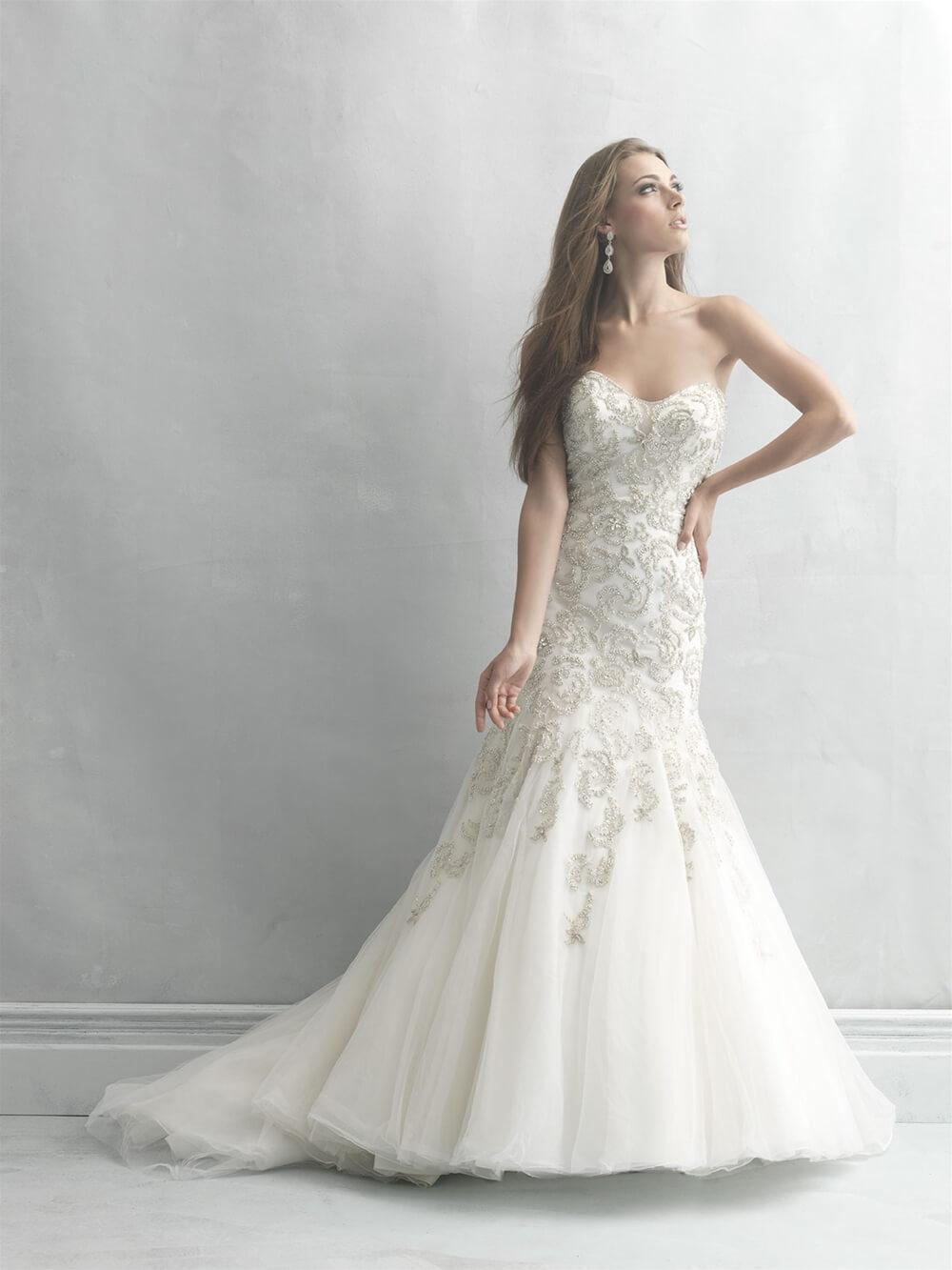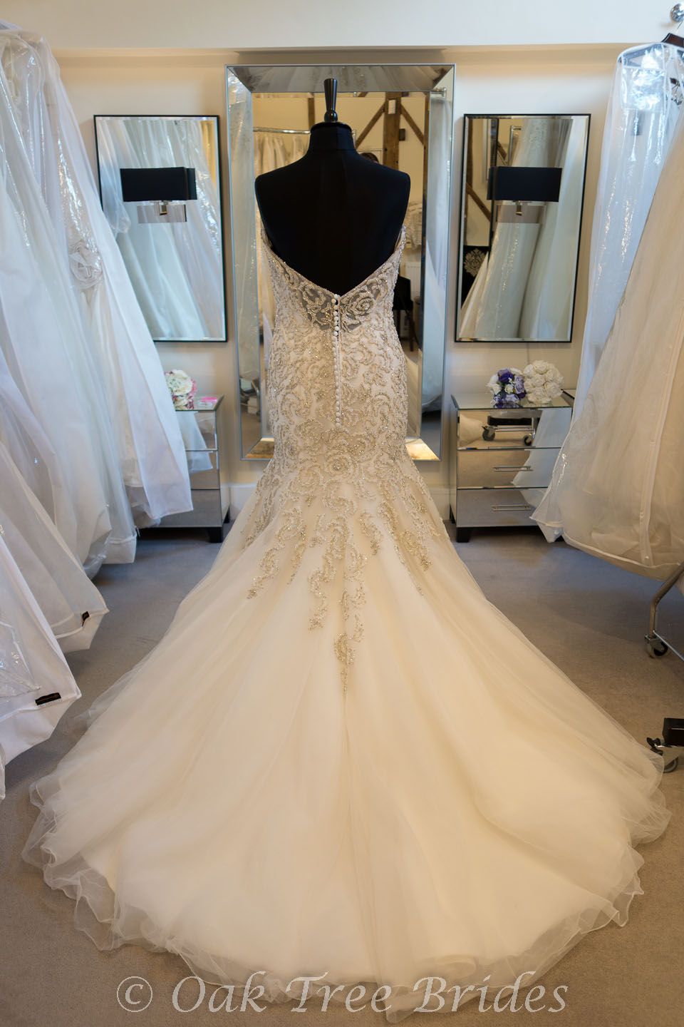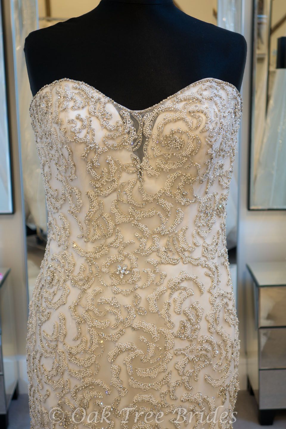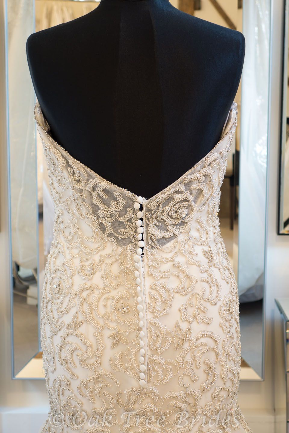 Description : A fit and flare wedding dress in tulle embroidered with pearlescent and crystal beading in a rose pattern. Sweetheart neckline and low back.