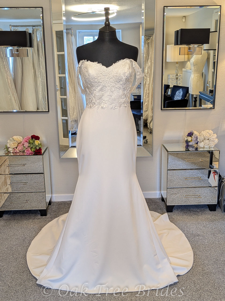Description : A fit and flare gown with lace bodice and form-fitting crepe skirt. Features a sweetheart neckline and off the shoulder lace sleeves.