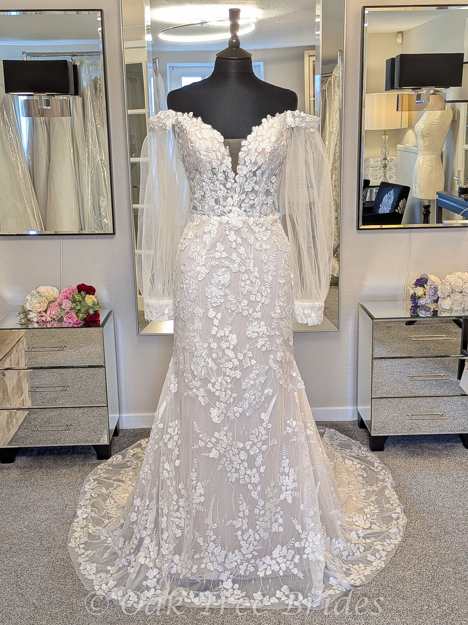 Description : A fit and flare gown in floral lace with off-the-shoulder, sheer bishop sleeves.