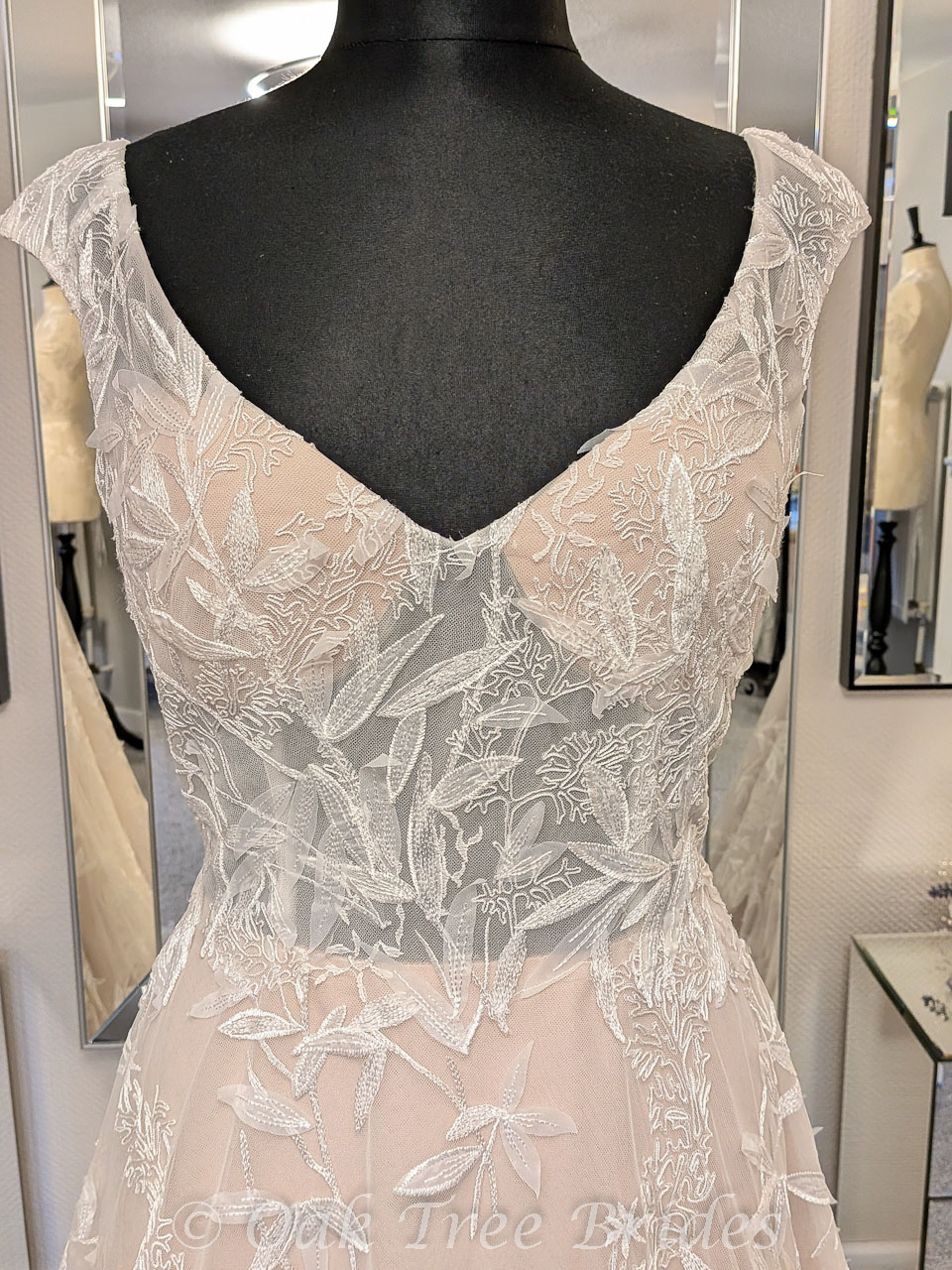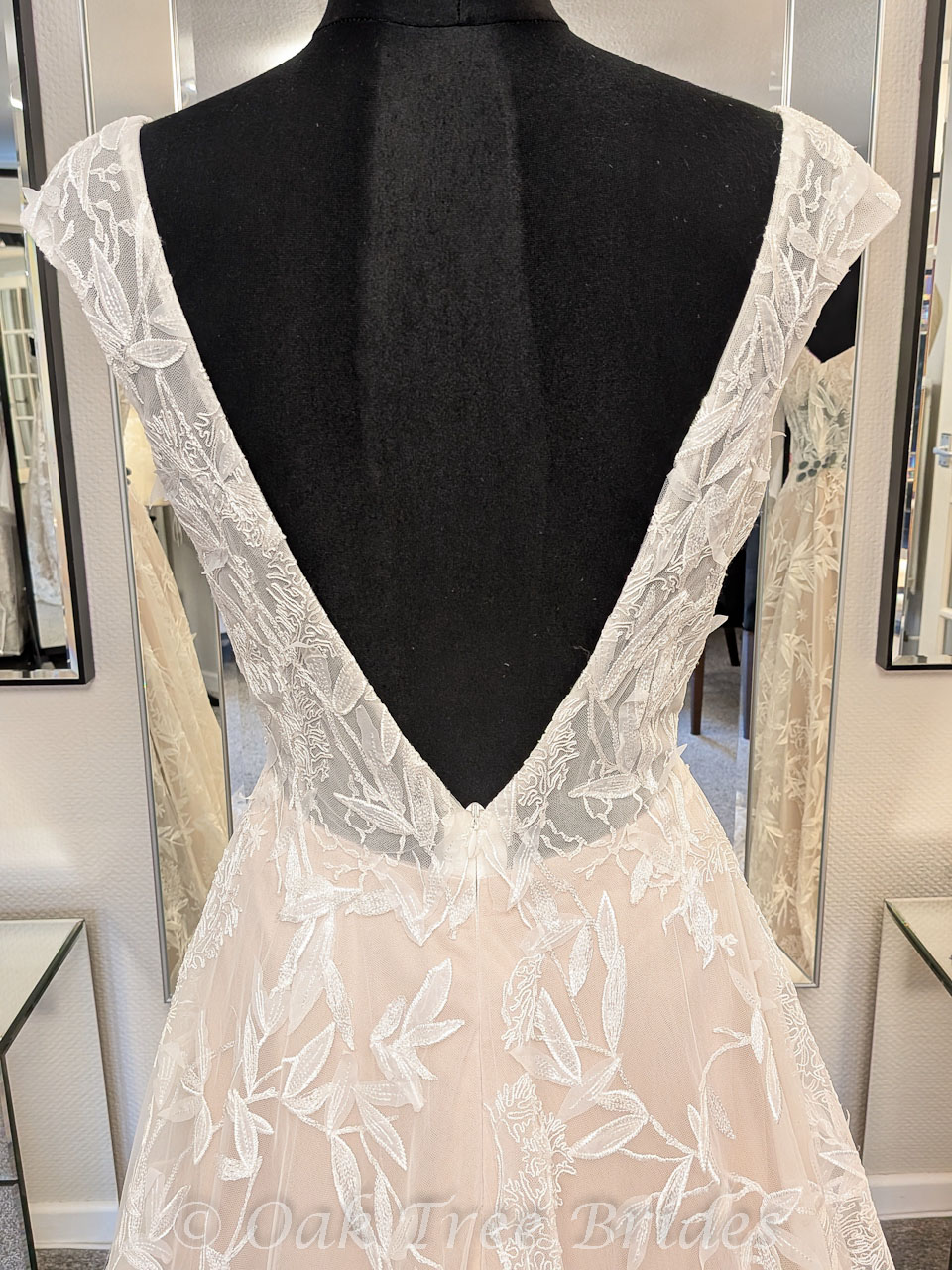 Description : An A-line gown in leafy lace with V-neckline, low scoop back and cap sleeves.