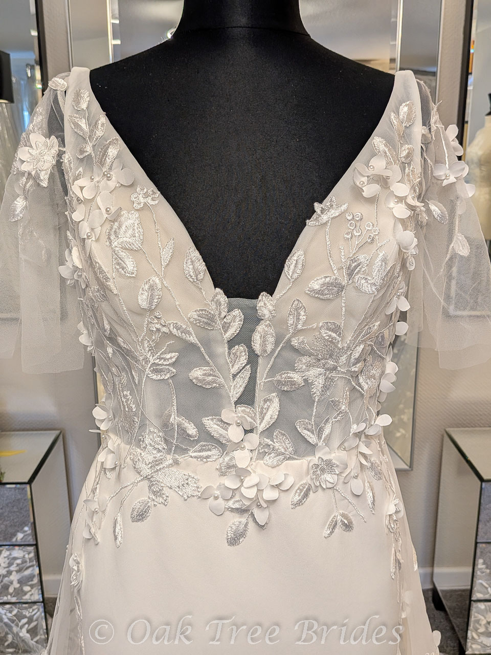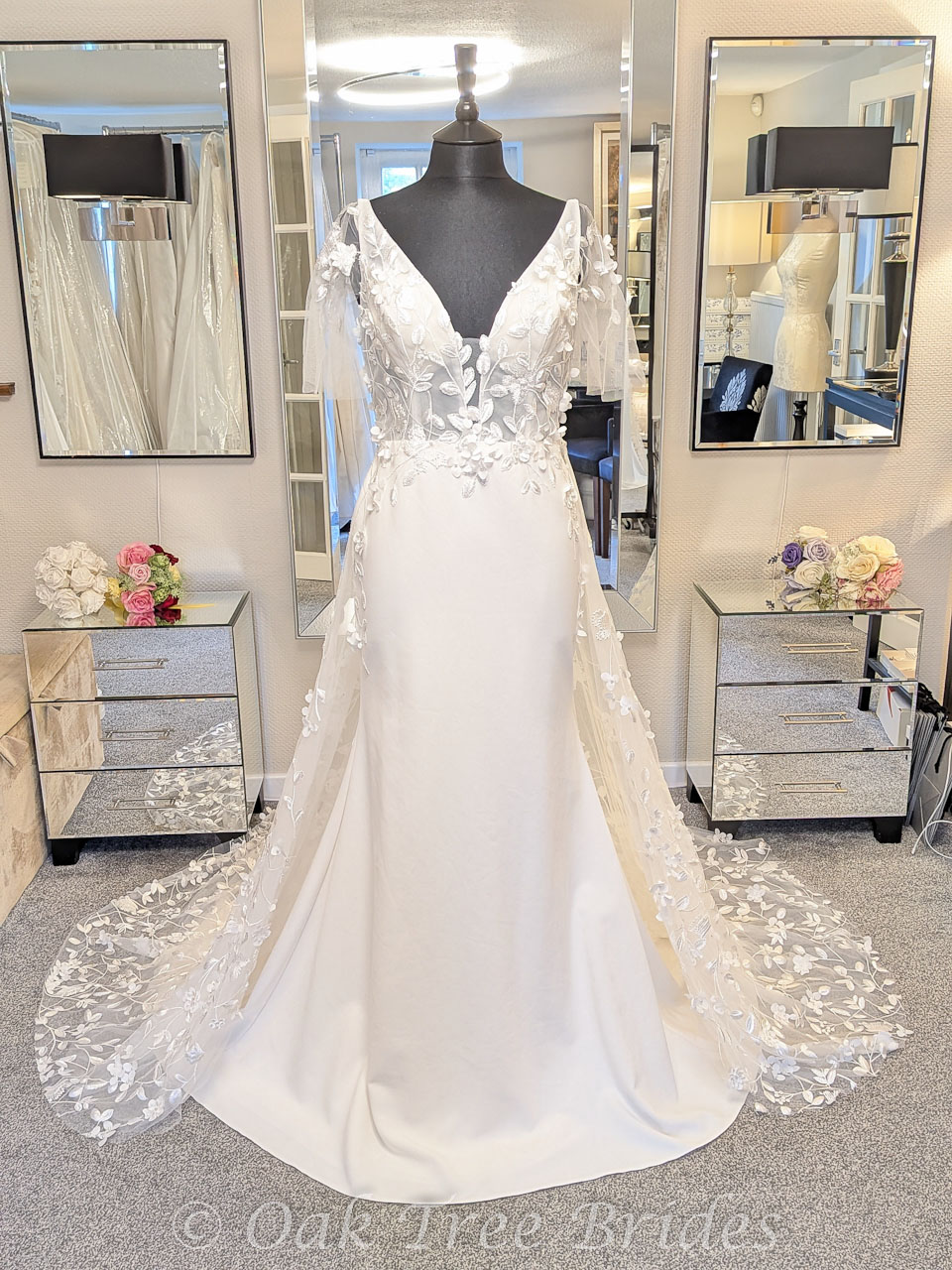 Description : A slim gown with embroidered petal lace bodice and sleek crepe column skirt. Features an deep V back, detachable fluted tulle sleeves and optional botanic lace overskirt
