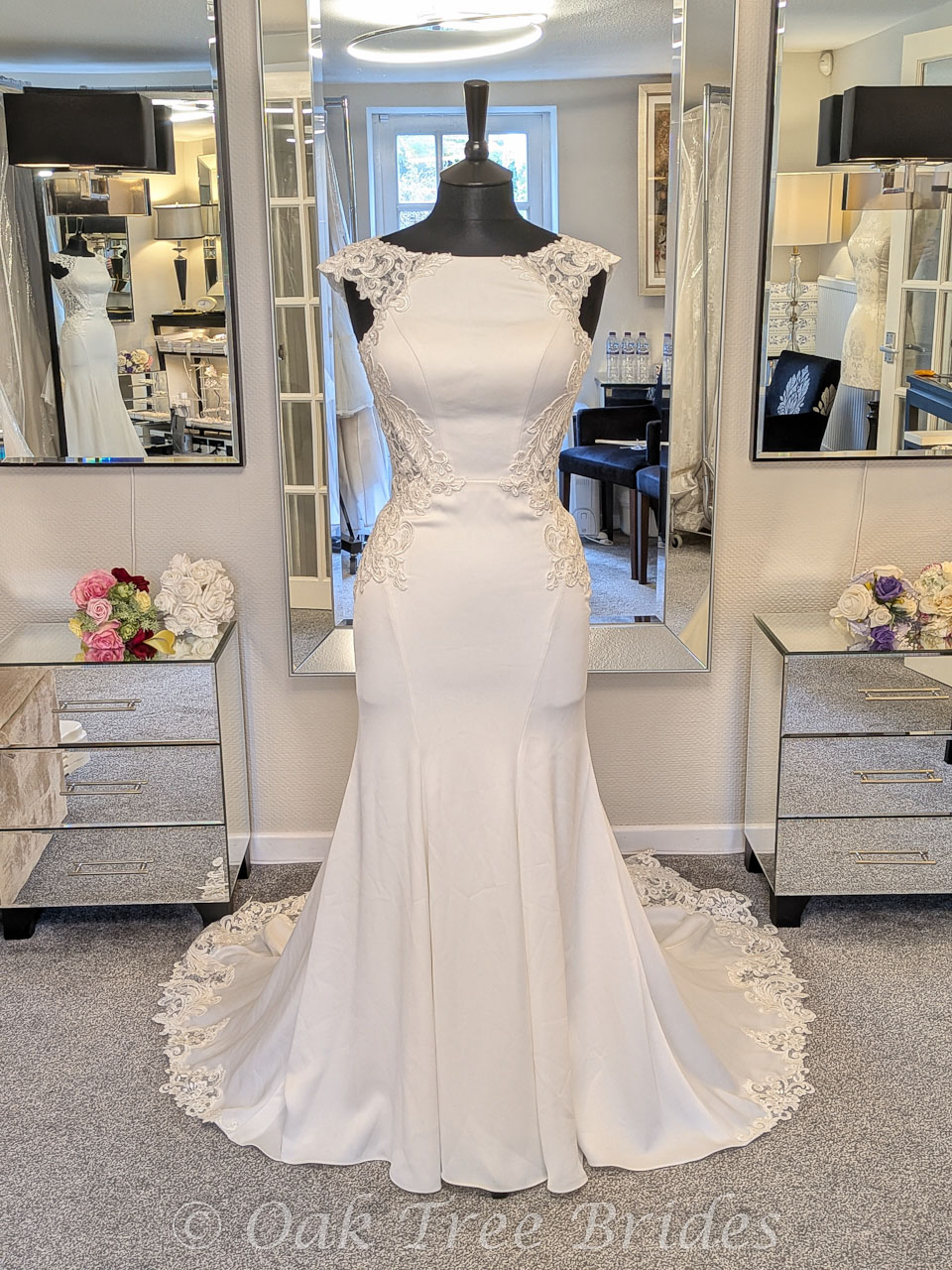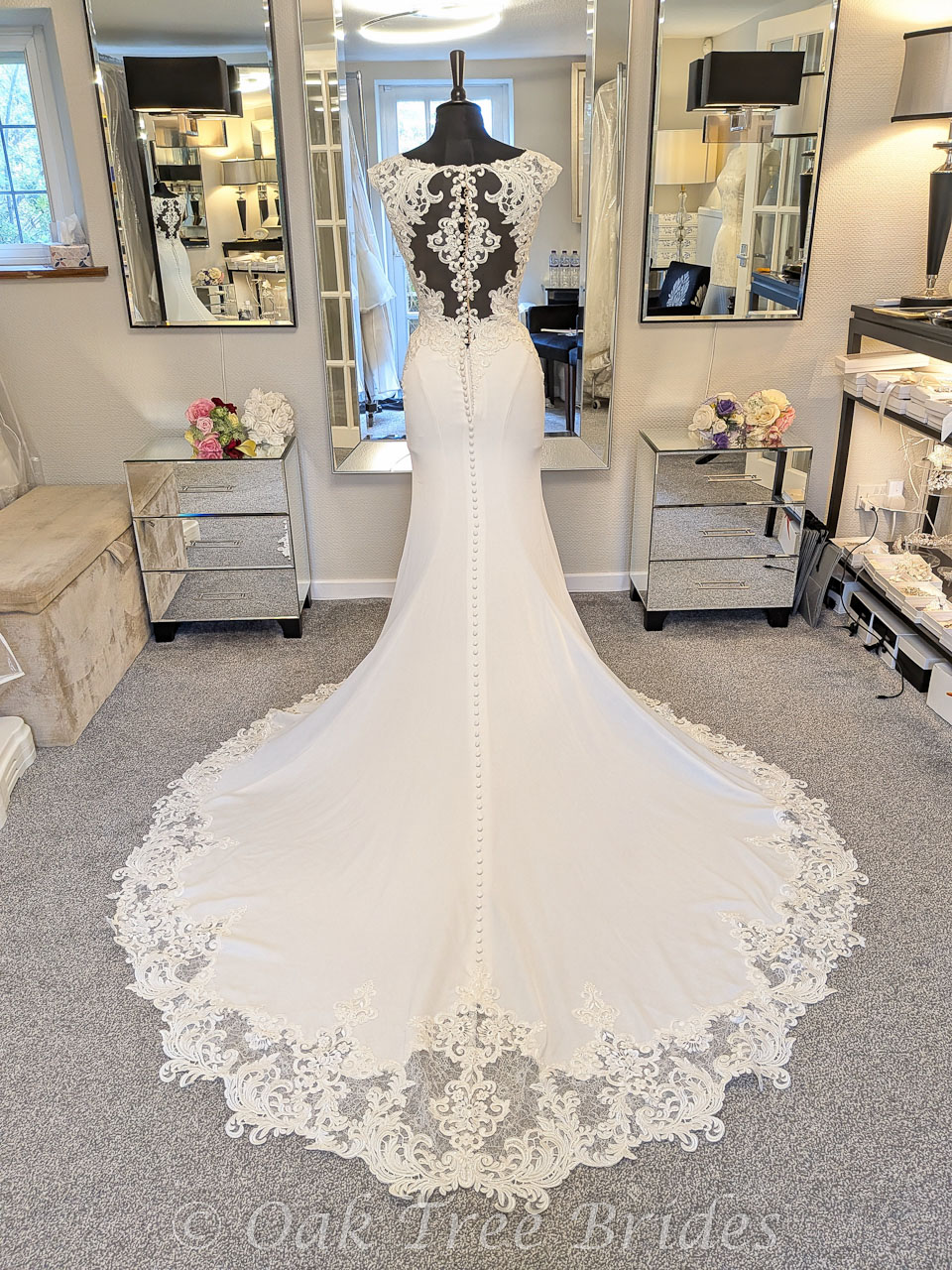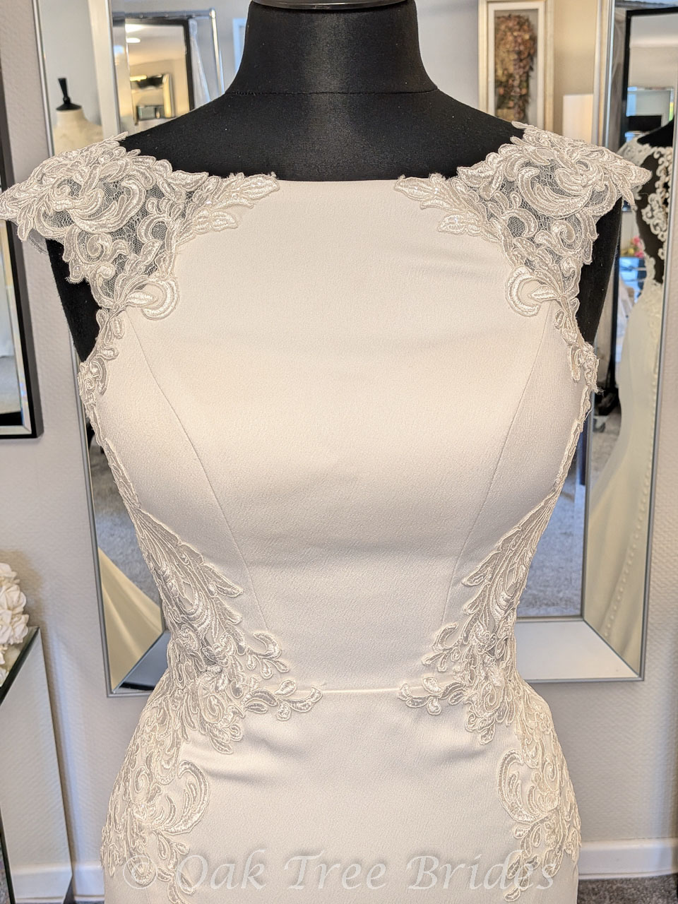 Description : A slim column gown in French lace and crepe with high neckline, lace cap sleeves, side cutouts and illusion back.